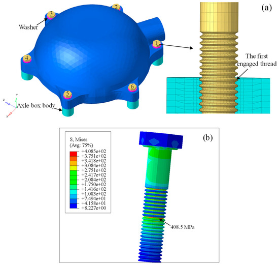 As a critical component in high-speed trains, the axle box is mainly composed of the axle box body and axle box front cover; the front cover is connected to the axle box body by six M8 × 40 steel bolts with strength grade of 8.8, as shown in Figure 1. After the high-speed train ran for a period of time on a certain railway line, the connecting bolts would loosen even fracture from time to time, but these failed bolts were theoretically far from reaching the design service life. To solve the problem, the failed bolt was replaced by a new bolt and some prevention methods were used to improve the service life of the connecting bolt, such as adopting a spring washer, replacing the lubricating oil with grease or increasing the preload; these methods are called common prevention methods in this study. However, the new connecting bolts still failed quickly, which obviously greatly threatened the operation safety of the high-speed train; only when the failure mechanism of the connecting bolt is found can the intractable problem be solved.