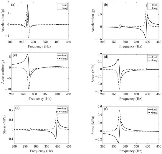 where M, C, and K are mass, damping and stiffness matrices, respectively; and are displacement and excitation vectors, respectively. Assuming that there are totally R modes, the load-stress FRFs can be obtained by Equation (12) [47]:
