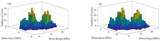 An equivalent stress amplitude and equivalent mean stress were obtained by the 2743 different stress ranges and mean stresses according to Equation (22). Then, the equivalent stress amplitude for fatigue calculation was obtained by Equation (23). According to Equation (25), the failure cycle that corresponded to each Ni was calculated. After getting all the 2743 failure cycles, the accumulation at the root of the first engaged bolt thread caused by transverse and axial cyclic stress can be obtained by Equation (26).