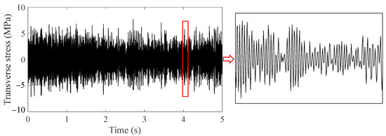 Subharmonic resonance of the front cover must be avoided to prevent the multiaxial vibration fatigue of bolts. There are two methods to improve fatigue life of bolts. One is to optimize the structure of the front cover so that the first-order modal frequency is greater than 290 Hz, which is half the excitation frequency of the 20th-order wheel polygon at the running speed of 300 km/h. Nevertheless, modifying the structure of a widely used component is costly. The other method is to prevent the formation of 20th-order wheel polygonization. In order to explore the fatigue behavior of bolts with no wheel polygonization, a sweep frequency test under the condition of wheel tread defect of wheel-flat but no polygonization was carried out. The reason why the wheel with defects was used instead of the new wheel after reprofiling was that the wheel would not be in a perfect state in most of the running time, so a working condition that was inferior to the new reprofiled wheel but better than the polygonal wheel was used. The same frequency sweep test was carried out as previously. The maximum vibrational amplitude of the multiaxial acceleration loadings from the axle box body was around 20 g at the linear speed range of 280–300 km/h, and the front cover was not in resonance; thus, the stress caused by bending modes of the bolt was ignored under the circumstances, and only the effect of transverse stress on bolt fatigue life was considered. The results of transverse stress simulation at the first engaged thread root and local amplification are shown in Figure 23. Obviously, there was an aperiodic vibration with smaller transverse stress amplitude in comparison with the resonance stress in Figure 21a.