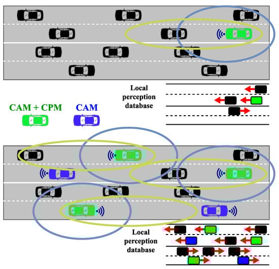 The technical report preceding the specification [] presented, along with the basic idea of the service and the message format, described two general use cases where the CP service can be utilized on its own, detecting non-connected road users and detecting safety-critical objects. In both use cases, the goal is to share information among vehicles about objects or other traffic participants that may not be visible to some, e.g., because of non-line-of-sight. Figure 1 illustrates how the number of perceived vehicles can expand using CPS [] and how it affects the functioning of the local perception database of a vehicle.
