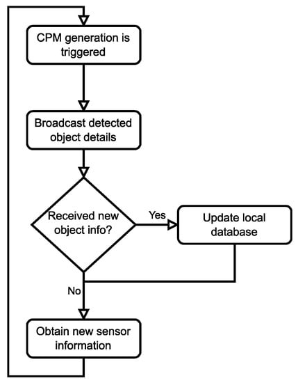 The Collective Perception Service (CPS) is an advanced Day 2 solution standardized by ETSI [,] that serves as a basis for advanced collaborative V2X applications for vehicles capable of sensing their environment. These vehicles using CPS will share their sensory information wirelessly, enabling the distributed or centralized processing of the collected data, which can be used in a diverse set of safety-related use cases. This service is a crucial milestone in reaching fully automated cooperative transportation systems. Yet, it should have a massive impact on the number and gravity of traffic accidents involving human drivers. To extend the perception of the environment beyond the range of the respective sensors of each vehicle, the service exchanges data via periodically sent messages. Since a wide variety of sensor types can be present on vehicles, these messages, CPMs, to be exact, are structured explicitly for sharing sensory data effectively []. The provisioned information includes the sender’s static and dynamic properties (exact details depend on the sender type, i.e., whether it is an RSU or a vehicle), the type and parameters of each sensor in use, and a list of detected objects with additional confidence values.