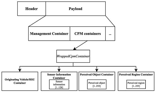 Figure 3 illustrates the general structure of a CPM. Since the messages are encapsulated with the common ITS PDU header, we will only focus on the actual payload structure, which contains the Management Container and other containers wrapped in a structure called WrappedCpmContainer. The Management Container provides basic information about the originating ITS station, like the reference time, position, and others needed to process the message. Depending on the type of the originating station, an Originating Vehicle Container or an Originating RSU Container is included in the CPM, e.g., the angle and magnitude of the velocity of a vehicle or the map position data of an RSU.