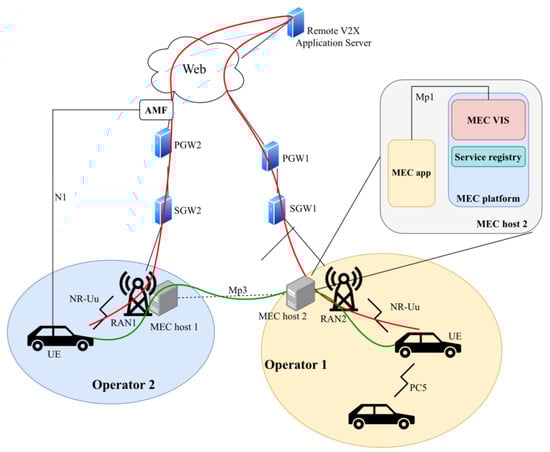 Regarding V2X, the devices communicating will be manufactured by multiple vendors and connected to numerous networks using various access interfaces. To facilitate interoperability in such an environment, ETSI has specified a new service, namely the V2X Information Service (VIS), as well as the data flows, data types, and the API required for accessing the service []. The document considers scenarios that combine single or multi-operator situations in terms of OEMs and Mobile Network Operators (MNOs) providing certain V2X services. Figure 4 illustrates how VIS enables “horizontal communication” between MEC services, thus interconnecting devices in different MNOs with lower end-to-end latency. It also implies the need for mobile network-level cooperation among other operators to ensure user service continuity. The VIS API further increases the accessibility of MEC in automotive scenarios involving a wide range of car manufacturers, device OEMs, MEC vendors, mobile operators, etc.