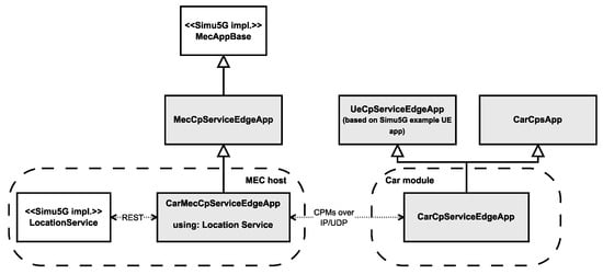 To our best knowledge, no such framework has been proposed to this day that simultaneously supports advanced ITS-G5 Facilities (like CP) and 5G protocol stacks. However, many other attempts have emphasized the justifiability of MEC-based systems in V2X use cases. These include model or framework proposals and sterling simulation results, further proving that many parties are interested in researching this topic. Despite the promising capabilities of simulating accurate network behavior, the one severe weakness of existing solutions is that they focus on one or, at best, two of the following critical aspects of a complete, realistic MEC-assisted V2X simulation model: 5G cellular network (incl. MEC), environmental model (traffic simulation + sensor suite), and the simulation of the ITS protocol stack. That means the missing part must usually be generated based on some available statistical data or over-simplified to completely hide the given aspect’s representation. One outstanding exception is the framework CrowNet used for a crowd-sensing strategies study []. This integrated framework consists of several open-source projects that also have an important role in our solution (see later in Section 4). The need for a slightly different approach is because CrowNet has a greater focus on integrating massive pedestrian mobility into the complete ITS simulation environment, whereas the subject of our study is the integration of collective perception and edge computing from the automotive use cases perspective. An interesting extension in CrowNet is the addition of control plane features to device-to-device (D2D) communications via the PC5 interface, something which is not yet present in our 5G model. However, it is on our roadmap to implement the control plane to be able to simulate the communication over the PC5 interface according to NR-V2X specifications.