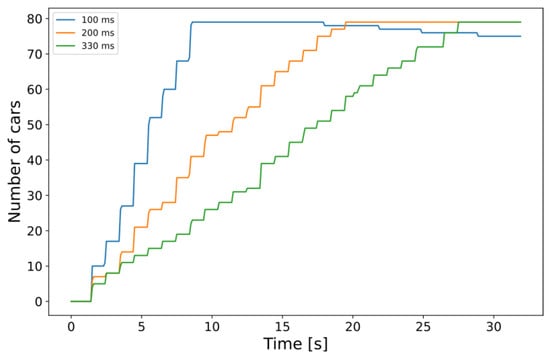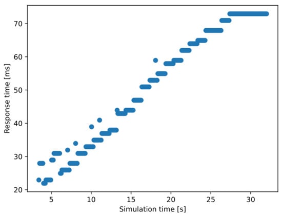 The value of 300 MIPS was much more demanding, as the vehicles entering the simulation early could experience worse than a threefold increase in response time throughout the simulation (see Figure 12). Still, the maximum values were around 80–85 ms, which is not ideal for V2X services like CP but is under the aforementioned 100 ms barrier (as in Section 2.2.2) that is considered necessary for such scenarios. Setting the requirements to 500 MIPS, however, breaks this barrier. Directly addressing the problem mentioned in Section 2.2.2, this means that the maximum acceptable complexity for an algorithm processing each message arriving at the edge application is somewhere between 300–500 MIPS for this particular model. Even though the average response time (also seen in Table 3) is just around 100 ms, some averages even reached 120 ms, meaning that CPMs generated with a frequency of 10 Hz would be obsolete when the response arrives. This observation might be useful when designing such edge services or algorithms to be able to balance the problem of required/available computational power of the MEC apps/server depending on the vehicle density. However, we have already noted that a more sophisticated parameter setup is needed for such evaluations.