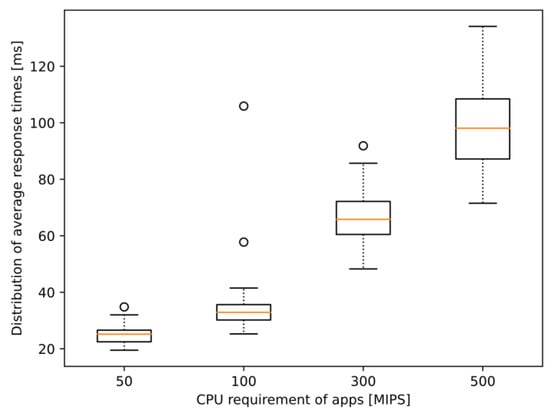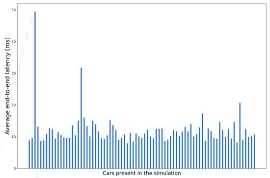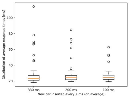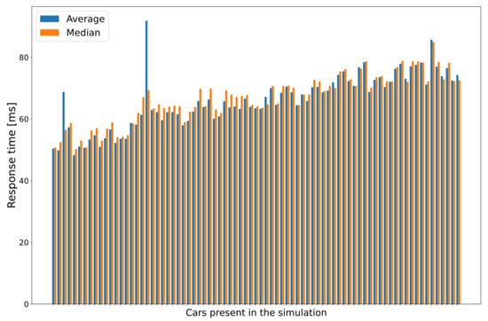 Looking at Figure 15, it can be observed that, although there is a marginal increase in the median of the average response times, the variance barely changes and the outliers also tend to be smaller. It seems that, despite our expectations and our previous results in Figure 10, the simulation runs with denser traffic were more stable in terms of performance. The reason behind the fact that a similar increase to what was present in the first type of scenario cannot be observed now might be that even if at some points during the simulations almost half of the cars had heavy demand, the number of such cars was constantly fluctuating. Therefore, at no single point in time did all the cars require that many resources (contrary to the first type of scenarios), and the MEC host was able to serve requests without a significant drop in performance. As for the reduction in the variance of the observed response times, we deduce that the outlier values gathered most of the extra latency at the network level, which again might occur due to anomalies in the OMNeT++ framework’s event system. Further investigation of both the resource allocation methods in the MEC implementation and the event management of OMNeT++ might give a better insight into the exact reasons for the obtained results. It is, nonetheless, a great experience that the integrated simulation framework could be successfully used in testing both MEC performance and advanced Collective Perception-based V2X services in various scenarios.