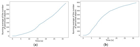 Running averages of the number of total perceived objects at the MEC aggregated level: (a) new car inserted every 330 ms on average; (b) new car inserted every 100 ms on average.