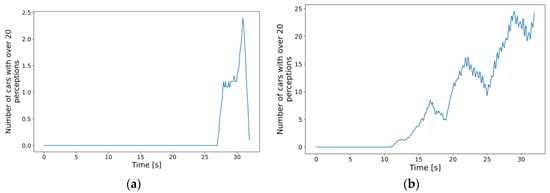 Moving window average (1 s) of the number of cars with more than 20 perceptions: (a) new car inserted every 330 ms on average; (b) new car inserted every 100 ms on average.