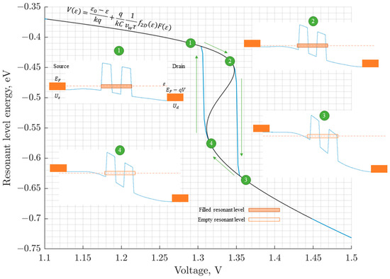 The external voltage, which is the argument of the energy function of the resonant level (17), changes monotonically, which is determined by the test conditions. However, the calculation of the energy of the resonant level in accordance with Formula (19) contradicts this, since it leads to the curve 1-2-4-3 (Figure 2). Therefore, in this section, a hysteresis description of the dependence of the energy of the resonant level on the external voltage is required (cycle 1-2-3-4-1).