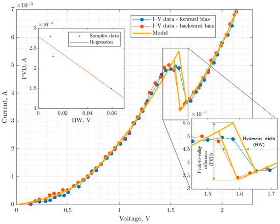 To validate the developed model, a simulation of the mentioned RTD was performed, and a comparison was made between the calculation results and the measurements of the I-V curves (current–voltage characteristics). The analysis of the calculated and experimental I-V curves was conducted based on the following parameters: average error at different regions, peak and valley current errors, peak voltage error, PVD (Peak-to-Valley ratio), and hysteresis width. Figure 5 shows the validation results of the model.