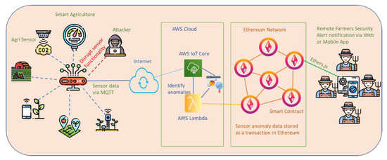 The cybersecurity structures now advocated in smart farming typically include chain management of food supply and testing of several accomplishments through data analysis techniques, cloud computing technologies as well as verification and authorization arrangements for sophisticated IoT devices based on machine learning/artificial intelligence [8,9]. It has also been observed that real IoT devices identified on the Internet were infiltrated and employed as a means to launch full denial-of-service (DoS) assaults and further harmful engagements, such as information leakage related to management and sensor data [10]. On the other hand, blockchain has emerged and evolved in a fascinating way and is currently being used in decentralized network systems such as IoTs [11]. Researchers have made a separate assessment of the blockchain advancement gaps for IoT security and safety difficulties, and they have advised and urged us to use blockchain-based monitoring for the general security of smart agriculture [12]. Traditionally, in order to extend the limitations of the current system and make progress in terms of security with blockchain-based system needs, we use blockchain arrangements to continuously handle information and store irregularities in blockchain transactions [13,14]. In this study, the AWS cloud, an Arduino gadget package with a Wi-Fi component (in Figure 1), and an Ethereum smart contract were used as an end-to-end action.