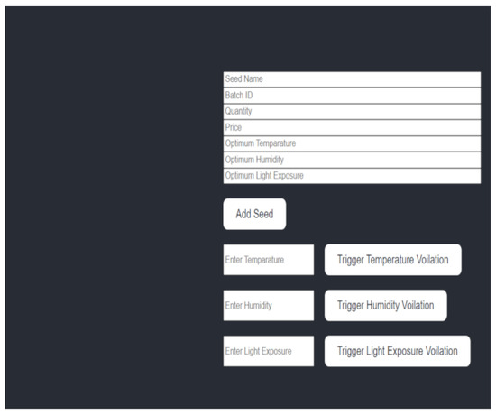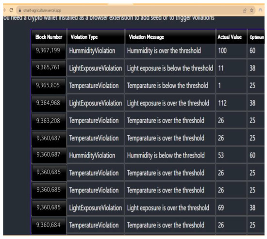 To quickly inform the farmer of a problem, we trigger a quick device alarm. In certain situations, it is critical to notify the user of a problem as soon as it occurs. This is especially true for safety-critical devices such as IoT industrial and medical equipment. With a quick alert, the user can be made aware of the problem and to act to mitigate it before it gets worse. First, we need to trigger a device alarm based on the organized sleep in seconds and check the number of blockchain transactions accepted for smart farming requests. We then set up a device alarm to determine the conditions that should trigger the device alarm based on the organized sleep in seconds. For example, if the sleep time exceeds a certain threshold, we trigger the alarm and then use the appropriate hardware or software components to generate the alarm signal, such as a buzzer, notification, or API call. Then we track the organized sleep time in seconds. This could involve using a timer or timestamp mechanism within our code or application that monitors the sleep period and keeps track of its duration. Next, we monitor the blockchain transactions by integrating a solution that allows us to monitor blockchain transactions related to smart farm requests. This could involve interacting directly with the blockchain network or using APIs provided by the blockchain platform or service we are using. In addition, we implement logic within our application to count the number of blockchain transactions accepted for smart farm requests. This may involve querying the blockchain for relevant transactions, filtering based on certain criteria (such as transaction types or smart contract interactions), and incrementing a counter for each accepted transaction. Finally, if the organized sleep duration exceeds the specified threshold and the number of accepted blockchain transactions meets our audit criteria, we trigger the device alarm. This could involve invoking the alarm mechanism we set up in step 1, such as sounding the buzzer, sending a notification, or making an API call to our device control system. Figure 5 and Figure 6 show alerts for smart-contract web applications’ frontend and the frontend GUI for smart-contract web application.