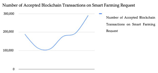 Our data were obtained from the device alarm triggering phase, when organized sleep is in seconds, to verify the number of blockchain transactions accepted based on smart farming requests. Organized sleep is a period of time when the blockchain network does not accept new transactions. This can be done to conserve energy or to prevent the network from becoming overloaded. The specific length of organized sleep depends on a number of factors, such as the number of devices connected to the network, the amount of data being transferred, and the desired level of security. Organized idleness also improves the efficiency of blockchain transactions by coordinating the idle time of devices on the network. This can be achieved by a software agent that monitors the network and aggregates idle devices for transaction processing. A blockchain-based system rewards devices for their idle time, making them more available for transaction processing. The data could be used to determine the effectiveness of the blockchain-based smart farming system. For example, if the number of accepted blockchain transactions is high, this could indicate that the system is working well and that farmers are able to use it to manage their farms efficiently. The data could also be used to identify any problems with the system. For example, if the number of blockchain transactions accepted is low, it could indicate that there is a problem with the system, such as a lack of connectivity or a security breach. Our tests were carried out in six phases as shown in Table 2, and the data obtained are shown in Section 4.1.
