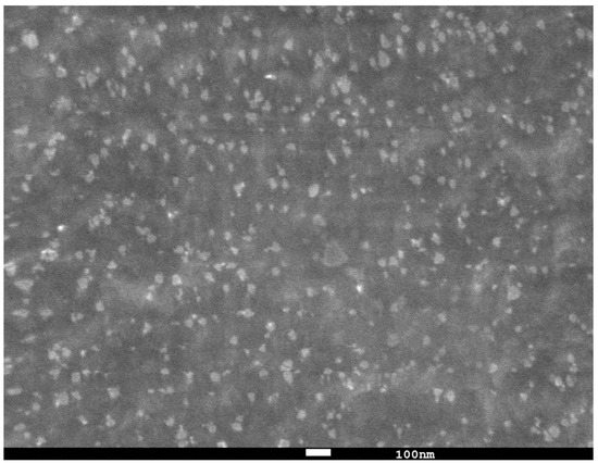 The nanocomposite obtained in the present study was characterized using scanning electron microscopy (SEM) (Figure 1). It indicates that AgTNPs are located on the surface of polymer membranes. The degree of their aggregation on the polyurethane foam is rather low and the nanoparticles are predominantly separated from each other. Electron diffraction from an individual silver triangular nanoplate is presented in the Supplementary Materials (Figure S2).