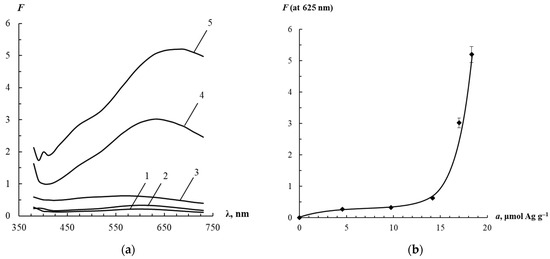 (a) Diffuse reflectance spectra of silver triangular nanoplates on the surface of polyurethane foam. Specific adsorption values a, µmol Ag g–1: 4.6 (1), 9.7 (2), 14.2 (3), 17.0 (4), 18.3 (5); (b) Dependence of the change in the Gurevich–Kubelka–Munk function at 625 nm on the specific adsorption.