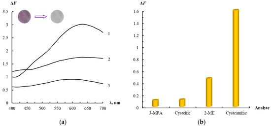 Some important features of AgTNP aggregation on PUF induced by organic thiols were evaluated. It was found that the structure of the analyte and the nature of additional functional groups have a direct effect on the analytical signal (Figure 3b). The greatest spectral changes are induced by the positively charged organic thiol, namely, cysteamine. For the electrically uncharged 2-mercaptoethanol, the signal is lower. When interacting with cysteine and 3-mercaptopropionic acid, the spectral characteristics of the nanocomposite change insignificantly, which may result from the presence of a negatively charged functional group at pH 5.0 in the structure of the analytes. Thus, we can suppose that the aggregation of AgTNPs is promoted with an increase in the number of positively charged functional groups (for example, –NH3+) and a decrease in the number of negatively charged functional groups (for example, –COO–). This can be achieved not only by varying the nature of the analyte, but also by changing the reaction conditions, mainly the pH of the medium.
