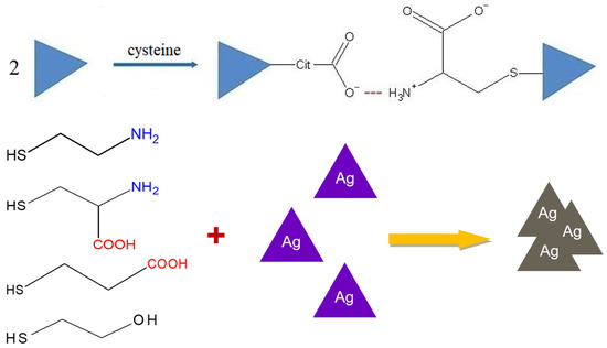 The mechanism of AgTNP aggregation under the influence of cysteine has been proposed by Y. Li and co-authors [37]. According to this paper, the mechanism includes the formation of cysteine–cysteine intermolecular hydrogen bonds between carboxyls and protonated amino groups of two opposite molecules. However, the fact that similar aggregative phenomena are observed in the case of thiols without carboxyl groups (cysteamine), amino groups (3-mercaptopropionic acid) or both (2-mercaptoethanol) allows us to assume that the interaction mechanism probably involves the participation of citrate ions on the surface of AgTNPs in the intermolecular bond formation (Figure 4).