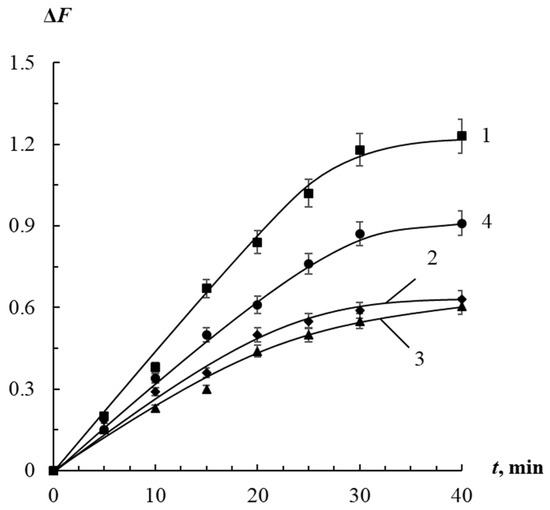 To plot integral kinetic curves for the interaction between the nanocomposite and organic thiols, a certain amount of analyte was introduced into polypropylene test tubes and the acetate buffer solution was added up to a volume of 5.00 mL. Then, the AgTNPs/PUF tablets were placed into the test tubes, squeezed with a glass rod, and shaken for a specified time. After the specific time, AgTNPs/PUF tablets were removed, dried between sheets of filter paper, and the diffuse reflectance spectra of nanocomposites were recorded. In all cases, the value of the Gurevich–Kubelka–Munk function change at the maximum of AgTNPs LSPR band (ΔF) was used as an analytical signal.