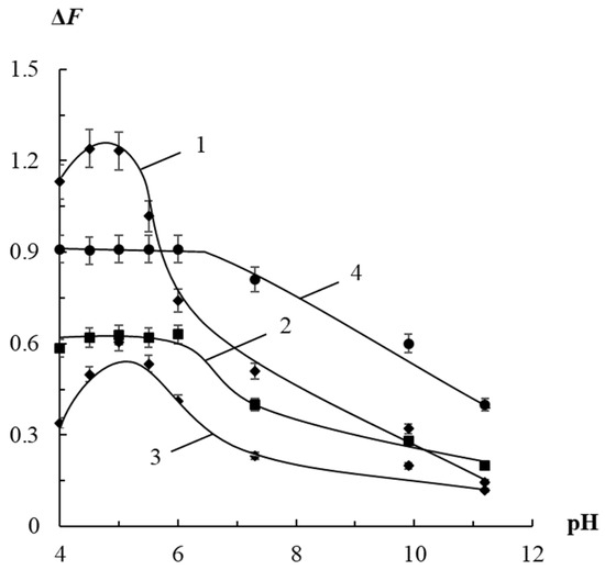 Change in the diffuse reflectance of AgTNPs/PUF composite in a solution containing cysteamine (1), cysteine (2), 3-mercaptopropionic acid (3) and 2-mercaptoethanol (4), depending on the pH value. c(AgTNPs) = 17 μmol Ag g–1, t = 40 min. (1) c(cysteamine) = 2 μM; (2) c(cysteine) = 10 μM; (3) c(3-MPA) = 10 µM; (4) c(2-ME) = 5 μM.