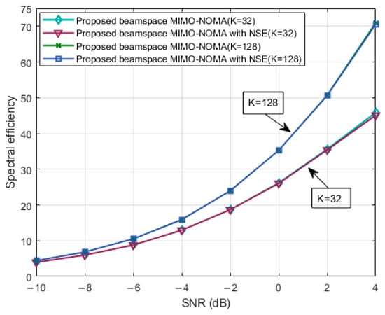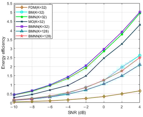 Figure 5 illustrates the comparison of energy efficiency versus SNRs with K = 32 and users for the proposed system and the baseline systems. It can be clearly seen that increasing SNR can lead to a substantial growth in energy efficiency, and within the same system, for both 32 users and 128 users, our algorithm outperformed BMN []. Furthermore, in different systems with 32 users, the energy efficiency of the proposed BMNN was higher than that of the other four baseline systems. Specifically, compared to BM, our proposed BMNN achieved higher energy efficiency, by integrating NOMA and beamformed MIMO, allowing each beam to serve multiple users.
