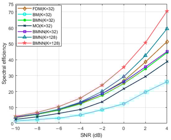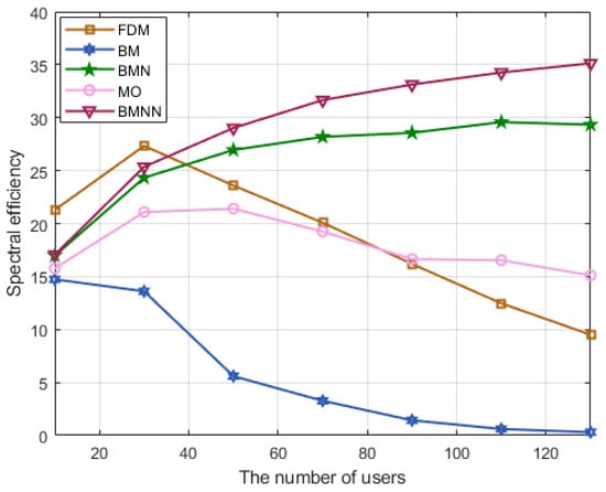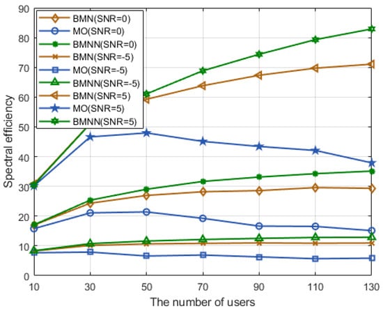 Figure 7 illustrates a comparison of the spectrum efficiency of the four schemes under different user scenarios at 0 dB. The BMNN scheme outperformed the BMN [], BM, and MO schemes. Moreover, compared to the traditional BM schemes, the BMNN optimization scheme proposed in this study further improved spectrum efficiency.