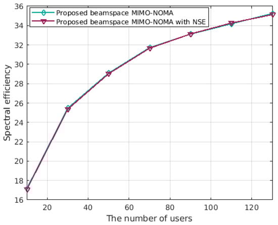 The aforementioned results were obtained while considering varying SNR, however, in real communication systems, especially in massive MIMO systems, the number of accessed users plays a significant role. Therefore, we further investigated the spectrum efficiency performance of the two proposed solutions under different user scenarios.