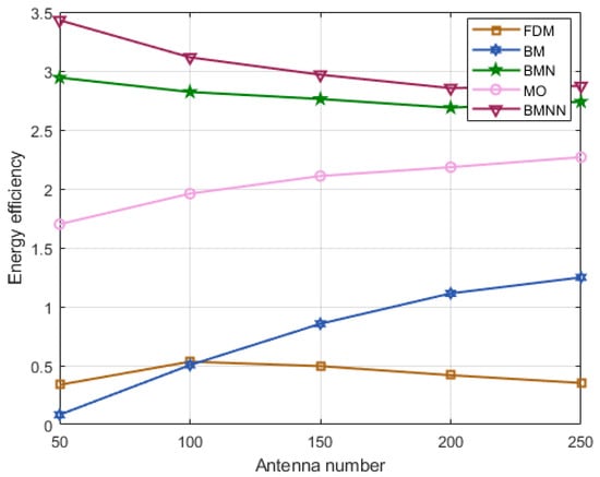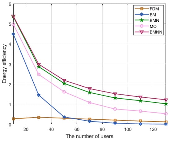 Figure 8 displays the energy efficiency performance for all considered schemes as the number of users increases. It is obvious that the proposed algorithm remained superior among the five schemes, which proves the effectiveness of the proposed scheme. Another noteworthy observation is that the performance of our proposed BMNN algorithm surpassed that of BMN [] in terms of energy efficiency. This is mainly attributed to the fact that BMN [] utilizes the ZF algorithm commonly employed in many studies in the precoding part, whereas our proposed algorithm optimizes the precoding parameters, thereby validating the necessity of optimizing precoding design parameters in our algorithm.