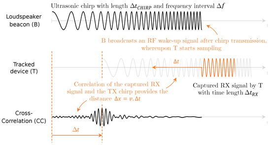 Visual representation of the low-power RF–acoustic ranging approach from [30]. Loudspeaker beacon B initiates a ranging measurement by broadcasting a linear ultrasonic chirp with length over a frequency interval . At the end of the chirp transmission, beacon B sends out an RF signal, signaling tracked device T to immediately wake up and sample a part of the still propagating chirp signal over a period . Depending on its distance to loudspeaker beacon B, the tracked device’s fragment will contain a specific frequency interval of the original chirp. Cross-correlation is used to find out which frequency interval was seen by tracked device T, resulting in a propagation delay and consequently the distance.
