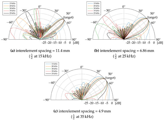 Although uniform planar arrays (UPAs) are considered throughout the remainder of this paper, we first assume three uniform linear arrays (ULAs) as a baseline for this study. As a UPA can in fact be seen as multiple ULAs packed together, a linear configuration simply allows us to study the beam patterns in only one dimension. The three ULAs consist of 10 omnidirectional loudspeakers. Each of the three ULAs is designed with a different interelement spacing, which has been set toa half wavelength at the design frequencies of 15 , 25 and 35 . Considering the propagation speed of sound in air (around 343 /), this corresponds to an interelement spacing of, respectively, , and . A ULA at the design frequency of 25 with spacing has been shown to be practically feasible by means of -by- MEMS transducers in [34]. To investigate the impact of chirp transmission on the beam pattern of each ULA, the transducers are excited with five different frequencies ranging between 15 and 35 . The target steering angle is set to an angle of 50°, chosen roughly in between the two steering boundaries, being the array broadside (0°) and the array axis (±90°). The calculations are performed in Matlab using the Phased Array System Toolbox.