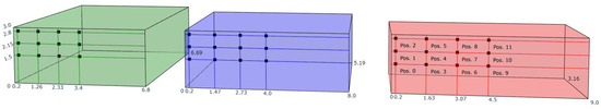 This section starts off with the first research question: Which UPA topology offers the best ranging accuracy in typical room environments? To avoid optimization for only one specific room, three shoe-box rooms with different dimensions are considered in the simulations. The rooms are presented in Figure 3, and the specific dimensions are shown in Table 1. Room 1 has a nearly square ground plane, while room 2 is a typical bar-shaped room with slightly different lengths and widths. Room 3 represents a hallway, where the length is significantly larger than its width. All rooms have the same height of 3 . Like the room’s dimension, the location of the UPA in the room can also affect the overall ranging performance. To make an abstraction in a similar way, twelve test locations (three rows, four columns) have been uniformly selected in one quadrant of the front wall, as shown in Figure 3. The locations are actually moved 5 from this wall to mimic real mounting. Within this quadrant, both the left column and top row of speakers are at 20 distance from the left wall and ceiling, respectively. The rightmost column and bottom row speakers are located on the center lines of the rectangular front wall, respectively, at and . The other test locations are chosen uniformly within this box of speakers, with the coordinates shown in Figure 3.