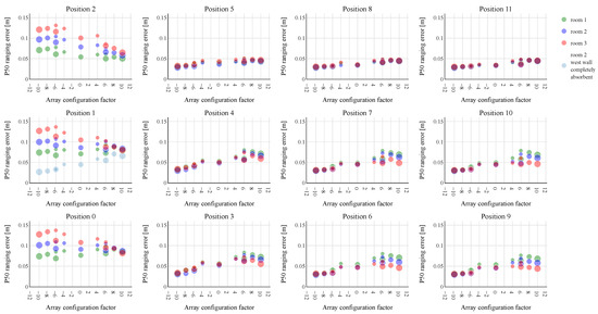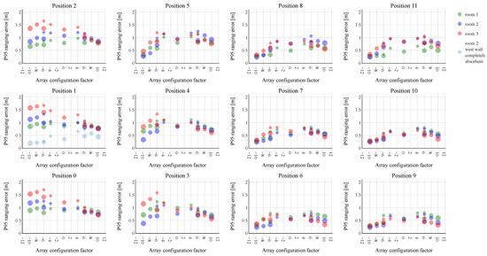 The simulation results concerning the P50 and P95 ranging errors are shown, respectively, in Figure 4 and Figure 5. Both figures show 12 subplots, each representing one of the tested UPA positions. The subplot in the top left of Figure 4 and Figure 5 (position 2) corresponds to the position at the top left corner of the wall in Figure 3. Each subplot displays the P50/95 ranging errors for the thirteen tested UPA configurations. To present the different configurations on a single axis (x-axis) in an intuitive way, each one is represented by an array configuration factor. This factor represents the number of speakers in the largest UPA dimension. A negative array configuration factor indicates that most speakers in the UPA are mounted above each other in the height direction of the room, while a positive value indicates that most speakers are positioned horizontally in the length. The array configuration factor corresponding to each array is presented in more detail in Table 2. As the 6 × 3 and 6 × 2 array designs have the same array configuration factor of −6, they can be further differentiated based on the number of speakers. A larger circle in Figure 4 and Figure 5 corresponds to more speaker elements, making it possible to distinguish both array configurations. The 4 × 4 UPA configuration forms an exception and is represented by an array configuration factor of 0. The room in which the ranging performance is evaluated is indicated by the same room color as in Figure 3.