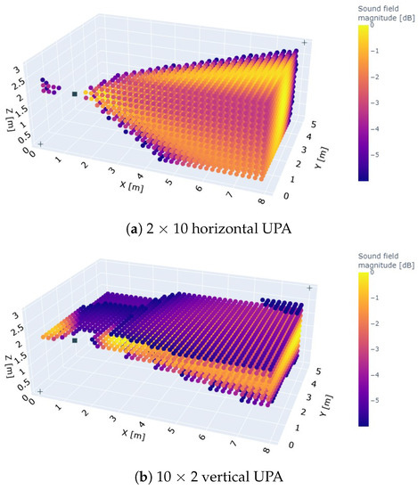 Thirteen UPA configurations were evaluated, listed in Table 2. To ensure that the considered UPA configurations are actually practically feasible, we used the ultrasound phased array from [34] as a baseline design. In the previous section, we showed that designing loudspeaker arrays at high frequencies results in very small interelement spacings (<1 cm). Consequently, we are very limited by the dimensions of the speaker transducers. The baseline design uses MEMS transducers that measure -by- and have a working frequency response in the (near-)ultrasonic range of 18 to 32 . Taking both the conclusions from the previous section and the working dimensions of the reference array into account, the interelement spacing of all UPA configurations are tuned to at the center frequency of 25 . The directivity pattern of a single speaker is set to a backbaffled subcardioid, in which acoustic transmissions at the rear are attenuated by means of an absorber. In this way, strong reflections on the wall behind the array can be prevented. In addition, we opted to limit the number of speakers to 20 at maximum, to limit the cost and complexity. The UPA configurations listed in Table 2 are presented in the format A × B. A represents the number of speaker rows, placed in parallel with the length of the room. B represents the amount of speaker columns, placed in parallel with the height of the room. A 2 × 10 configuration, for example, has 2 rows of 10 speakers on top of each in other in the height direction.