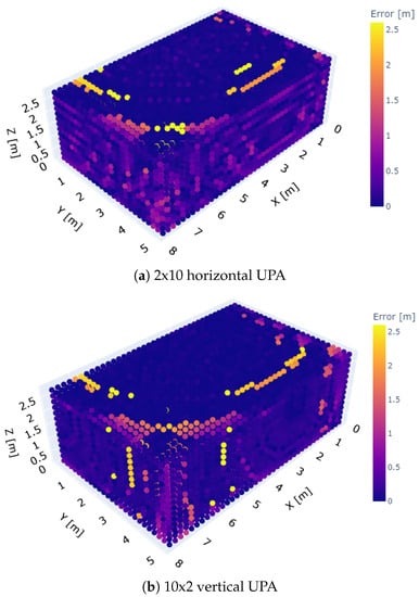 While the preceding simulations indicated which UPA configurations led to a low ranging error, they did not show how the vertical array configurations managed to outperform the horizontal arrays for the other positions (3 to 11). To gain more insights in this regard, the spatial distribution of the ranging errors over the entire rooms is examined. Two examples are shown in Figure 7a,b, where a 2 × 10 and 10 × 2 array are placed at UPA position 7 of room 2, respectively. The UPAs are not visible in the figures as they are located on the left rear wall of the rooms shown (room 2 from Figure 3 has rotated a little over 90° clockwise around its ground plane’s normal). The simulated ranging error in every microphone location is indicated using a color. When both error distributions are compared, larger ranging errors can be observed near the walls for the 2 × 10 horizontal array case. Moreover, the same observations can be made when the arrays are placed in UPA positions 3 to 11 (not shown). Since the 10 × 2 array has a narrow main lobe in the vertical direction, this indicates that reflections through the floor and ceiling potentially play a significant role in the ranging performance. After all, the height of the room is small compared to the length and width of the room, so the little-attenuated first-order reflections through floor and ceiling and their derivatives could easily interfere with the LoS.