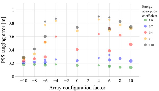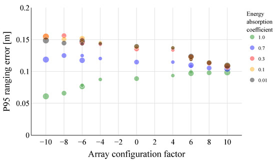 Figure 9 shows the P95 ranging error for the different array configurations and energy-absorption coefficients of the side walls. It can be seen that, in fact, lower ranging errors are achieved with horizontal array configurations, at least for the energy-absorption coefficients of the side walls, between and . When the side walls are completely absorbent, the vertical array configurations again take the upper hand.