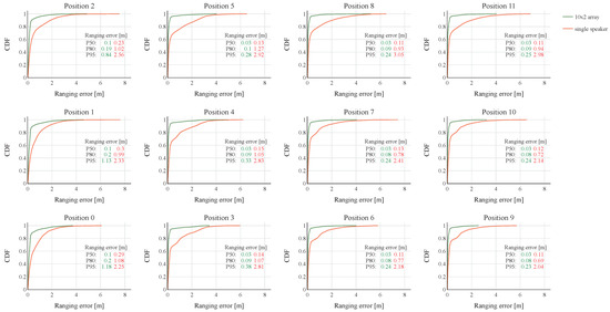 Figure 10 shows the cumulative distribution function (CDF) plots of the ranging errors for both the 10 × 2 vertical UPA and the single speaker case in all twelve tested transmit positions. The plots are based on the distance errors simulated in all microphone locations spread across the entire room. In addition, the P50, P80, and P95 ranging errors are listed to allow a simple numerical comparison. The results show that in all tested transmit positions, the UPA significantly outperforms the single speaker setup. The 10 × 2 array is able to lower the P50 ranging error with a factor of 3 to 5 at all positions. In position 9, for example, the P50 is brought down from 11 to only 3 . The ranging performance of the UPA especially excels when the P80 and P95 are compared. When looking at position 9, which shows the lowest ranging errors, both the P80 and P95 are reduced with a factor of 8 to 9. For some other UPA positions, the P80 and P95 errors even drop a spectacular entire order of magnitude. This shows that the UPA is able to reduce many outliers very effectively through its narrow ultrasound beams.