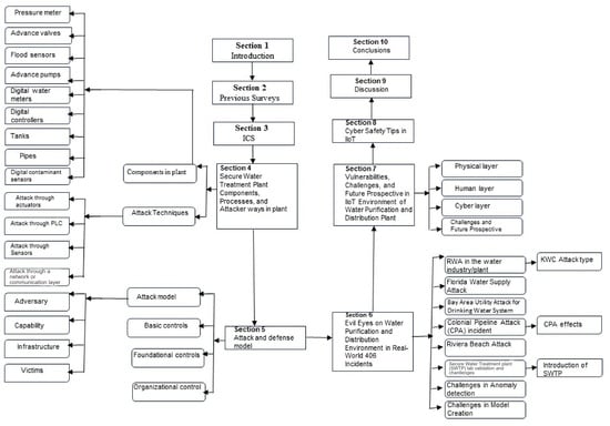 The rest of the paper has been organized as follows: Section 2 concerns the comparative evaluation of previous surveys. In Section 3, we discuss the architecture of the industrial control system. Section 4 contains a discussion of secure water treatment plant components and processes, as well as the methods by which an attacker could gain access to a plant. In Section 5, we discuss the attack and defense model in the ICS environment. Section 6 concerns attacks on water purification and distribution plants in real-world scenarios. In Section 7, we discuss the vulnerabilities, challenges, and future of water purification and distribution plants, while Section 8 concerns cyber saftey tips in IIot. In Section 9, we discuss security in water purification and distribution plants, and our conclusions are given in Section 10.