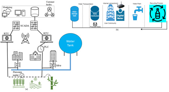 (a) Old architecture of a water distribution system. (b) Architecture of a water purification and distribution system.