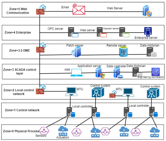 As a result of these security measures, some limitations have been suggested by security experts for access to the OT network. There are some other works in the ICS security field intended to enhance protocols, standards, and components to support security benefits. In an ICS, the development of technology has merged the IT and OT networks, which is known as IIoT and is without air gaps. Figure 4 is an ICS network architecture that consists of various zones and can be described as an industrial automation and control system security. Basically, a zone is defined as a set of devices or components (IT and OT) joined together for a subclass of applications in an ICS environment.