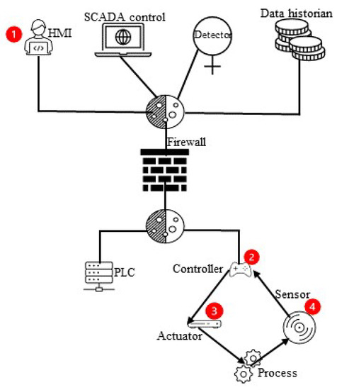 The authors of [13] studied all means of maliciously accessing a plant such as through sensors, actuators, networks, and PLCs, etc. In [26,27,30,31,35,36,39], the authors studied attacks through sensors in the environment. Ref. [28] shows an attack via an actuator in the plant. Refs. [31,35] also show means of attack via PLCs’ and actuators’ communication and more than one PLC communication network. The researchers in [35] also represent an attack through PLCs and sensors and the PLC communication link, while [39] only covers attacks through sensors and actuators. Still, there is a lack of security management and the tools necessary for a secure system.