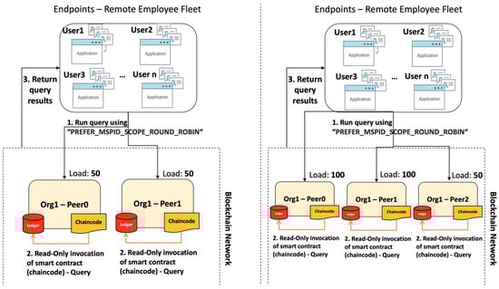 The last available native strategy is “PREFER_MSPID_SCOPE_ROUND_ROBIN”. Round Robin is a static algorithm that works in a circular and ordered manner. Each peer is assigned a query without any form of prioritisation. Furthermore, assuming 100 users query peer0 and peer1 of Org1 through the chaincode to evaluate Chrome’s hash presence on-chain (transaction), the algorithm distributes the load equally to both peers. In the meantime, we assume that a third peer is added on OrgHQ (peer3—OrgHQ) and another 50 users try to query the ledger against another application (e.g., outlook.exe). In this case, since the Round Robin algorithm works in a cyclic manner, we will have peer1 and peer2 managing the initial 100 requests, while peer3 will manage 50 requests. Hence, Round Robin fails to distribute the query load in an efficient routine. This is visualised in Figure 5.