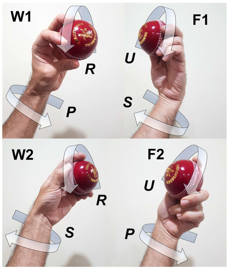 Directions of forearm and finger rotations when executing finger (F) spin and wrist (W) spin Type 1 and Type 2 deliveries; W1 = wrist spin type 1; F1 = finger spin type 1; W2 = wrist spin type 2; F2 = finger spin type 2; U = ulnar abduction of fingers; R = radial abduction of fingers; S = supination of forearm; P = pronation of forearm (cf. Table 1 and Figure 2).