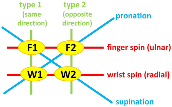 Schematic of the kinematics of forearm and finger movements when executing finger (F) spin and wrist (W) spin Type 1 (T1) and Type 2 (T2) deliveries; ulnar: left hand palmar view or right hand dorsal view, the fingers rotate the ball clockwise in ulnar direction; radial: left hand palmar view or right hand dorsal view, the fingers rotate the ball counterclockwise in radial direction; the terms “same direction” and “opposite direction” refer to the directions in which forearm and fingers move (cf. Table 1 and Figure 1); W1 = wrist spin type 1; F1 = finger spin type 1; W2 = wrist spin type 2; F2 = finger spin type 2.