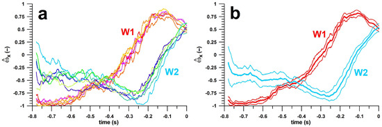 x-component of the unit vector of the angular velocity (ω) vs. time; (a): raw data (6 datasets per delivery); (b): average ± 1 standard deviation; W1 = wrist spin type 1, W2 = wrist spin type 2.