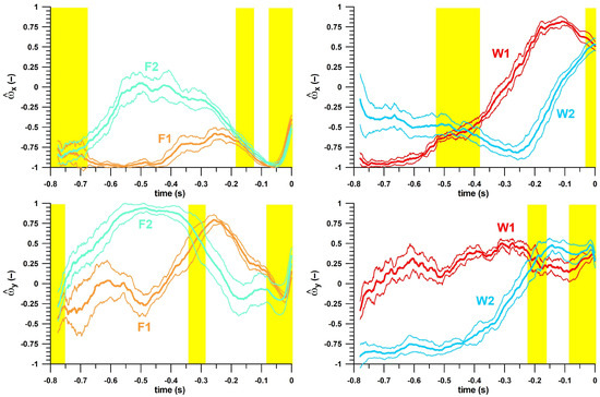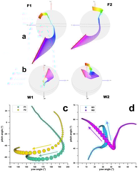 The average angular velocity vector diagrams of all four deliveries are shown in Figure 4a. To understand the differences of the rotating ball when executing the deliveries, the intersection points of the consecutive vectors with the surface of the ball, i.e., the paths of the spin axis, are shown by means of a plate carrée map projection in Figure 4b,c. F1 and F2 deliveries exhibit similar trends and shapes of the spin axis paths, whereas W1 and W2 deliveries are different.