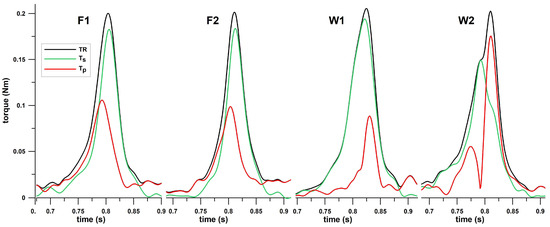 The torque diagrams are shown in Figure 5. There is no difference between F1 and F2 in terms of shape and magnitudes of TR, Ts and Tp, which matches the results of Figure 4b. The Tp spike is located in the first half of the TR spike. The difference between W1 and W2 is obvious from the Tp data: a single Tp spike in the second half of TR for W1, and two Tp spikes with the second one being excessively high for W2. Equally, this striking difference matches the results of Figure 4c.