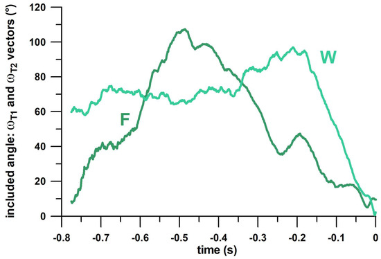 Angle between the angular velocity (ω) vectors of Type 1 (T1) and Type 2 (T2) plotted against time, for finger spin (F) and wrist spin (W) separately.