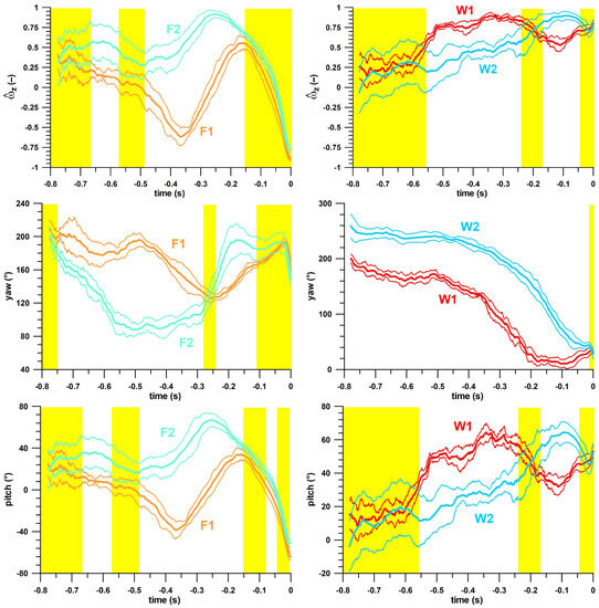 Kinematic parameters against time for finger spin and wrist spin Type 1 and 2 deliveries (average ± 1 standard deviation); the kinematic parameters are: x-, y-, and z-components of the unit vector of the angular velocity (ω), and Euler angles (yaw, pitch) of the unit vector; F1 = finger spin type 1, F2 = finger spin type 2; W1 = wrist spin type 1, W2 = wrist spin type 2; the yellow zones indicate time zones unsuitable for distinguishing between Type 1 and Type 2 deliveries.