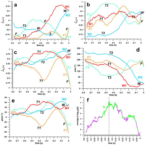 (a–e): kinematic parameters (components and Euler angles of unit vector ω) against time, for identification of common and uncommon features of the averages of finger(F) spin and wrist(W) spin Type 1 (T1) and Type 2 (T2) deliveries; F1 = finger spin type 1, F2 = finger spin type 2; W1 = wrist spin type 1, W2 = wrist spin type 2; P = pronation, S = supination; (f) differentiation between T1 and T2 from critical time stamps at which T1 and T2 are maximally separated (8 parameters: ωy, ωz, yaw, and pitch of finger spin and wrist spin); p = p-value; log10 = decadic logarithm; s (green) = significant: all 8 p-values < 0.05; n (purple) = not significant: at least one p-value > 0.05.