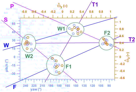 Pitch angle vs. yaw angle of the angular velocity vector (of the smart ball) and z-component vs. y-component of the unit vector (^) of the angular velocity (ω); the 4 data clusters (taken at 0.44 s before the peak of the torque spike) are identified by 4 ellipses; W = wrist spin, F = finger spin; T1 = type 1, T2 = type 2; F1 = finger spin type 1, F2 = finger spin type 2, W1 = wrist spin type 1, W2 = wrist spin type 2; P = pronation, S = supination.